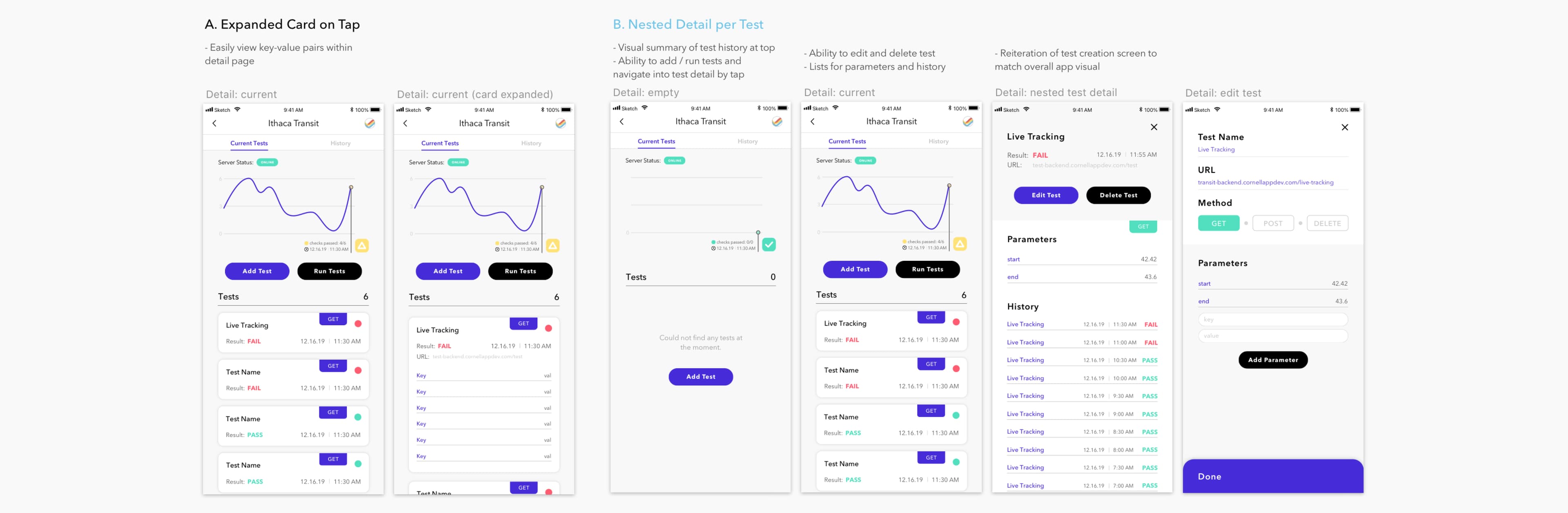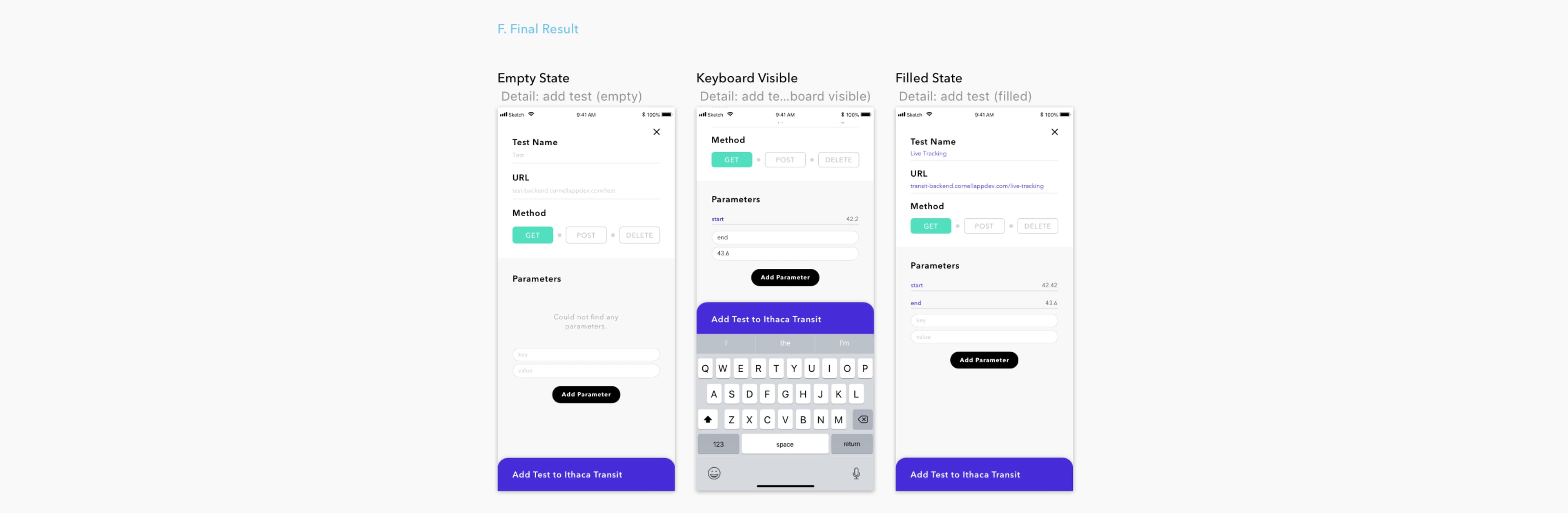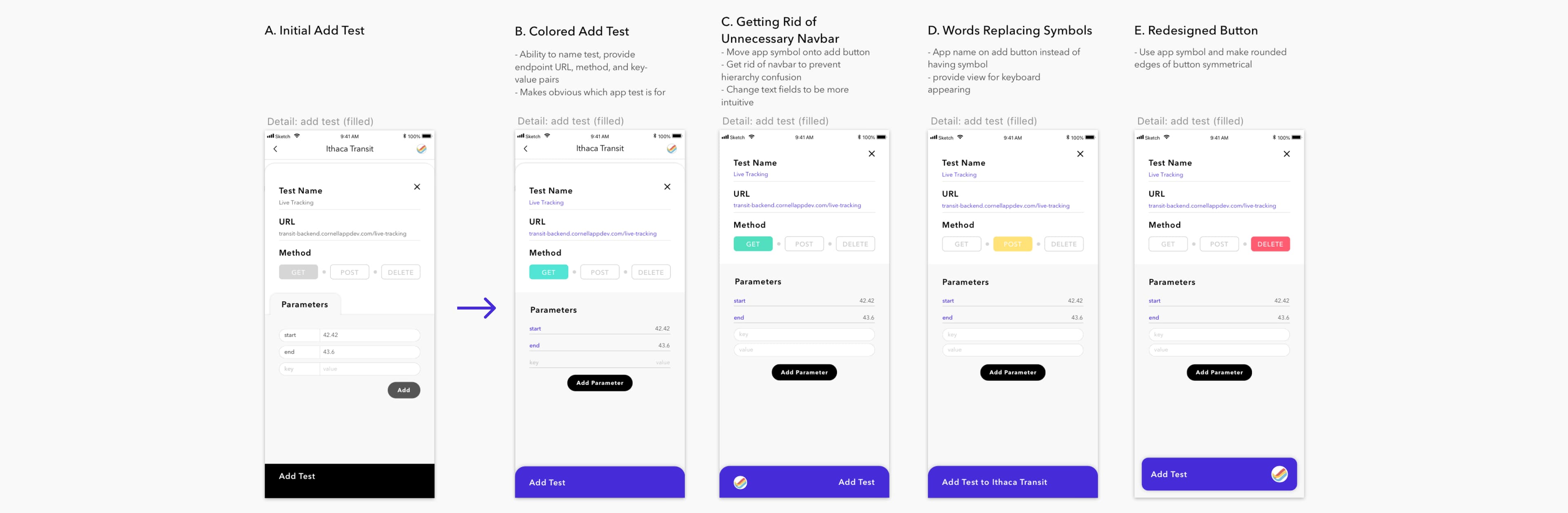 Combining the removal of the navbar, full name "Ithaca Transit" on the "add test" button, and separated parameter inputs, I created the flow of adding a test, as defined in Option F.