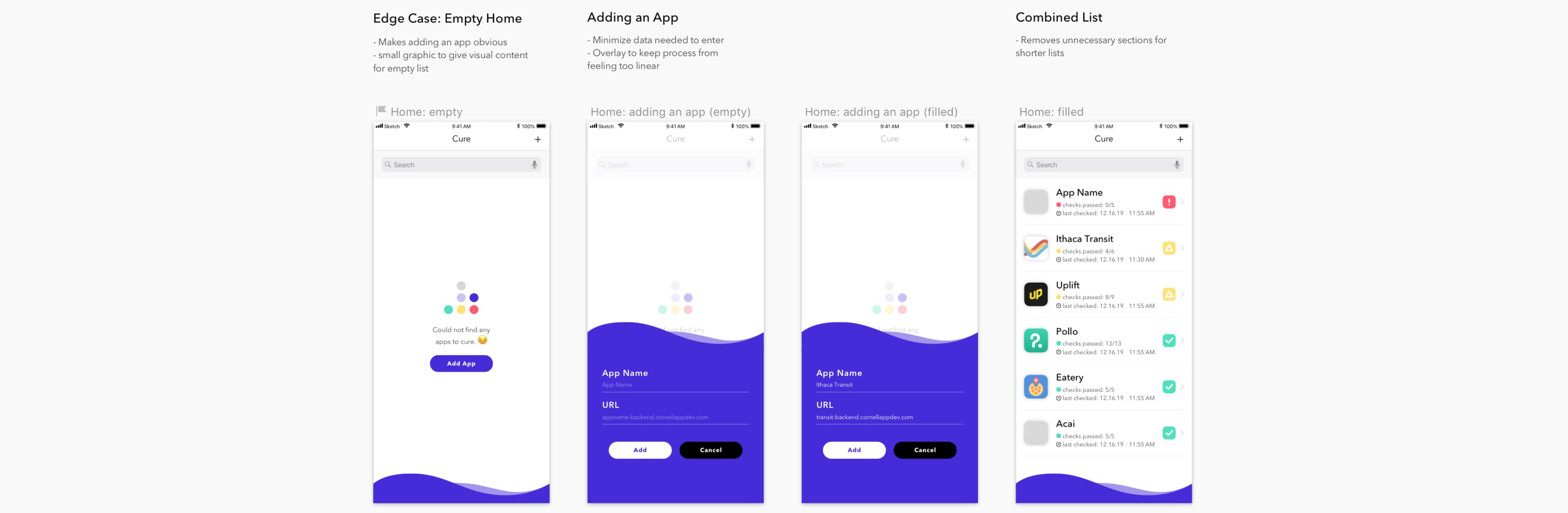 With this, I returned to the original home screen, adding a small footer to establish Cure's indigo colors. I then implemented the flow for adding a new app to Cure, which would entail user entries of the app's name and URL for its base endpoint.