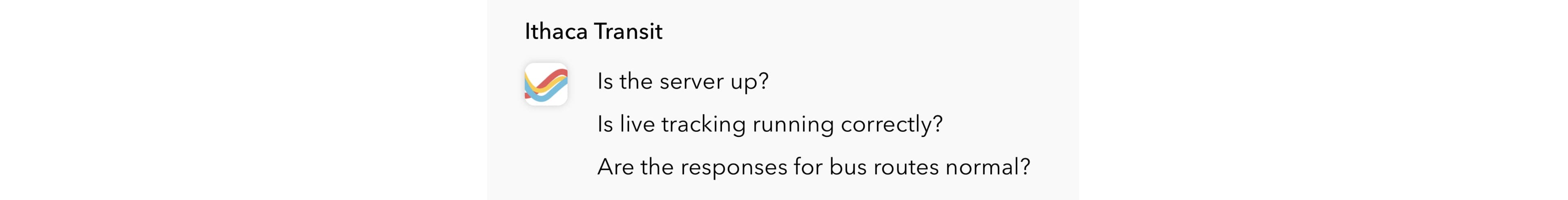 As members of Cornell AppDev, we often hear complaints of bugs that occur within our apps. One of our apps, Ithaca Transit, which provides students with the TCAT bus schedule and live tracking of its location, had various issues with its backend server this past semester. However, we often aren't aware of these problems, until someone tells us. To combat this issue, we decided to create an app to notify us when these bugs occur, particularly, through checking backend responses.