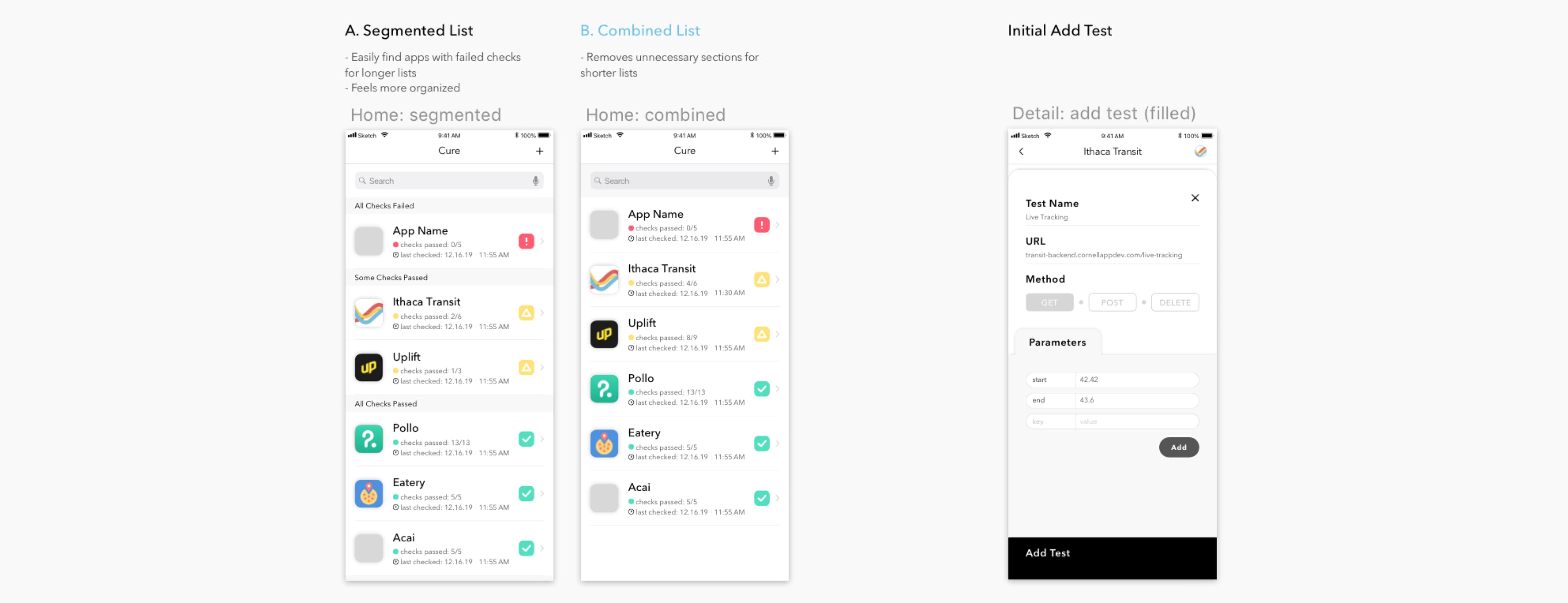 For the home page, I thought to categorize the added apps by the result of their latest route checks as per Option A. However, because of the limited number of apps Cornell AppDev manages, the division was unnecessary. So, I sought to combine and sort them instead, as shown in Option B.