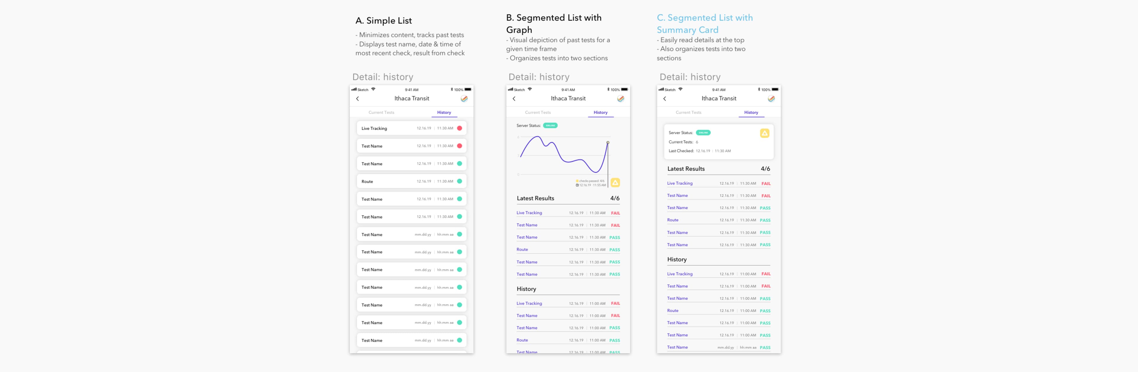 With the history tab, I started off with Option A as a simple list, displaying past tests, sorted by their date and time. Most recent route checks were displayed at the top. Nonetheless, Option A does not have much visual hierarchy.