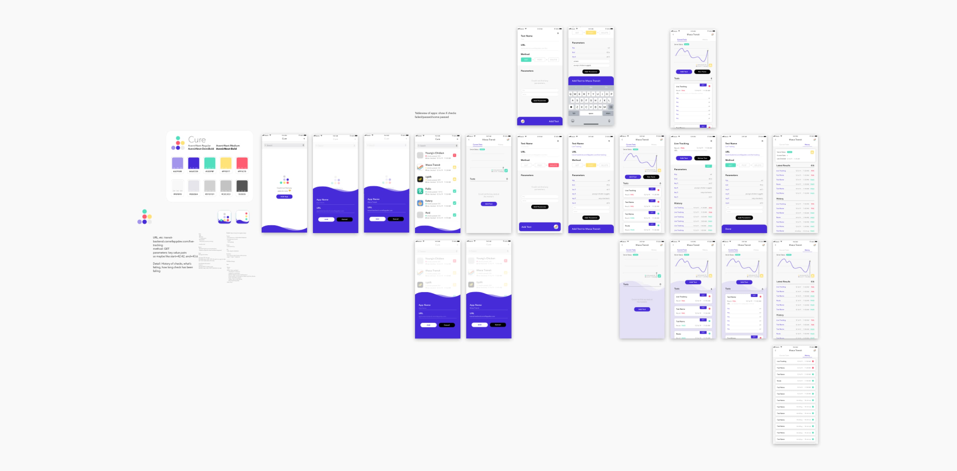 To iterate Cure's newly defined color scheme and branding, I changed the main inputs (test name and endpoint URL) to indigo, along with parameter keys, and the "add test" button. I used green, yellow, and red to further differentiate the selection for the test's request method. I then proceeded to revise the overall display of adding tests.